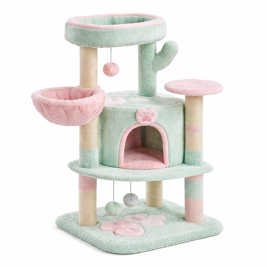 Árbol para gatos con rascador y cueva de MDF rosa verde