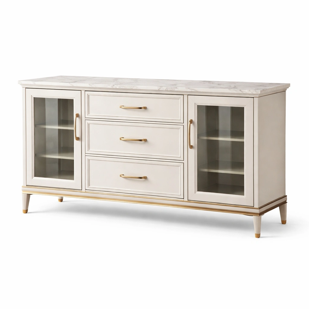 Aparador de madera con superficie de mármol y puertas de vidrio templado