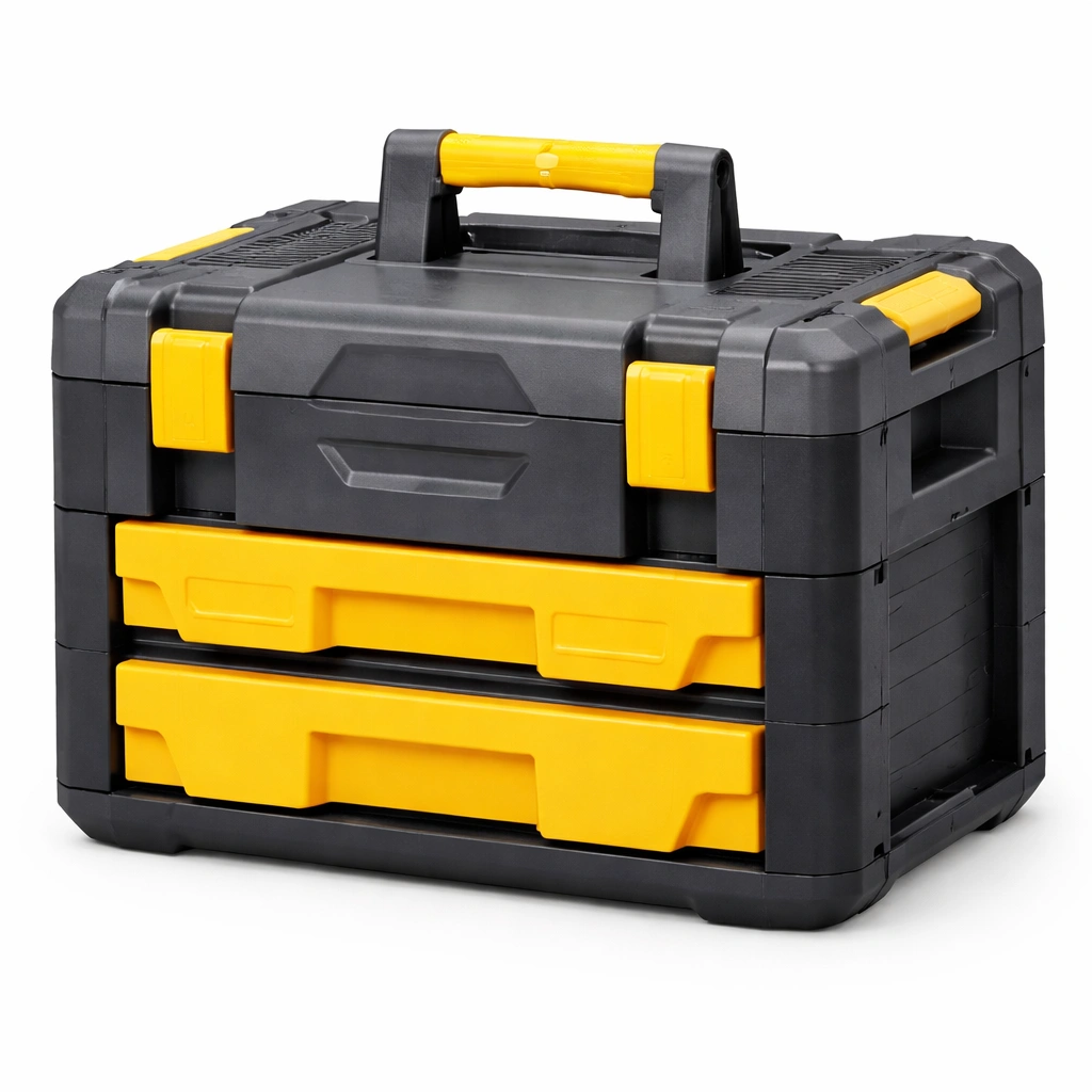 Incluye dos cajones extraíbles que facilitan el acceso a herramientas pequeñas y medianas, optimizando el espacio gracias a su diseño apilable.